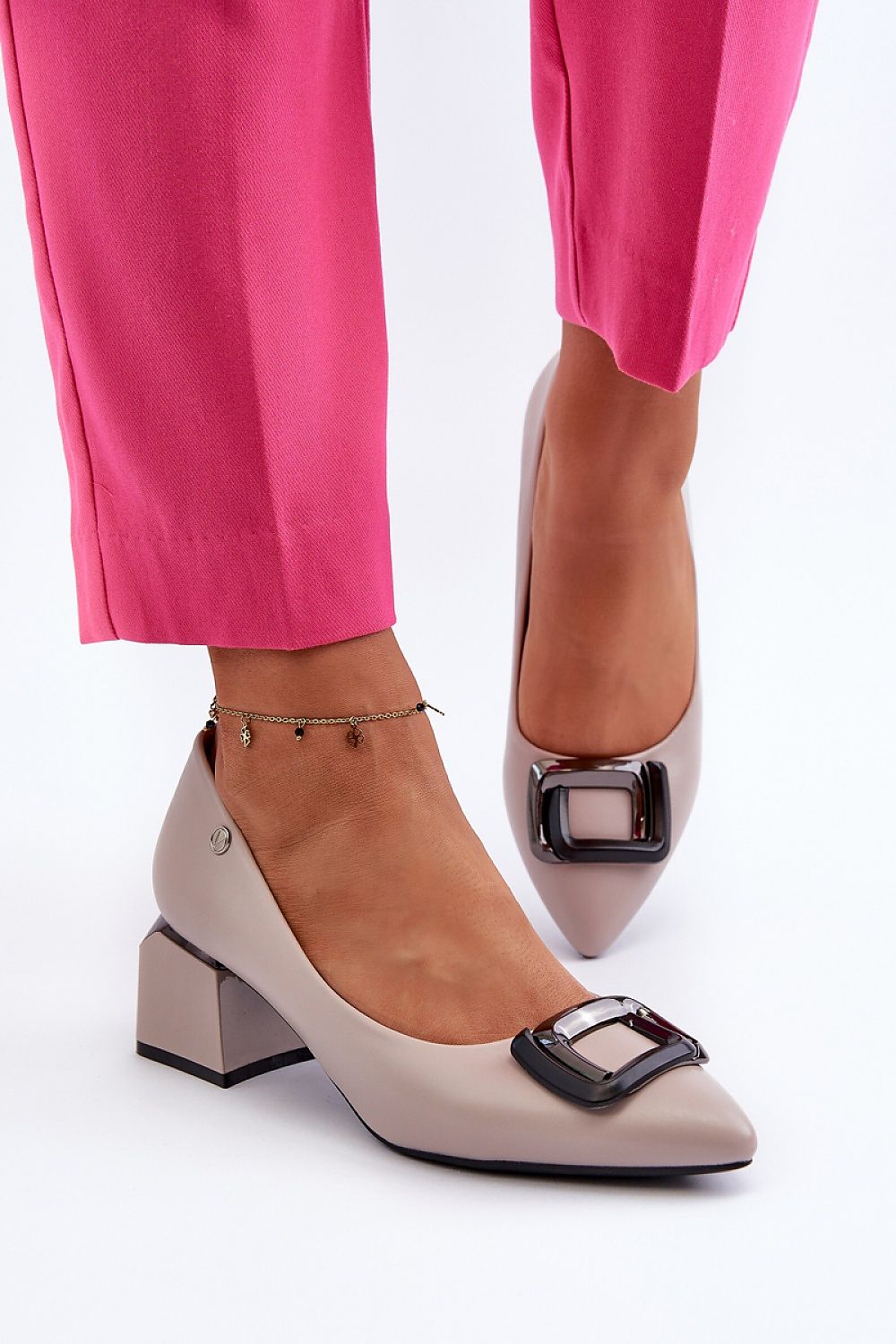 Women's pumps by Vinceza. Made of eco-friendly leather. The block heel adds elegance, making them the perfect choice for work and formal family occasions. The pointed toe visually slims the legs. Embellished on the front. This elegant style is a must-have for you!