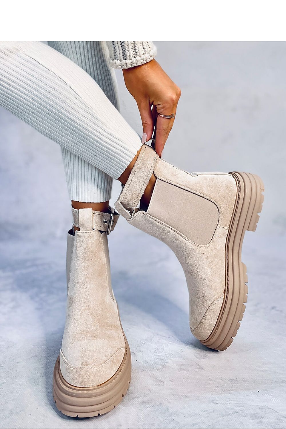 Women's suede boots - pumps with a thick sole. A belt with a buckle (removable) diversifies the design of this model. If you're ready for a little madness, order them today : ) The boots have rubber inserts that ensure comfortable putting on. The inside of the boots is lined with soft fur. Outer material - eco-friendly suede.