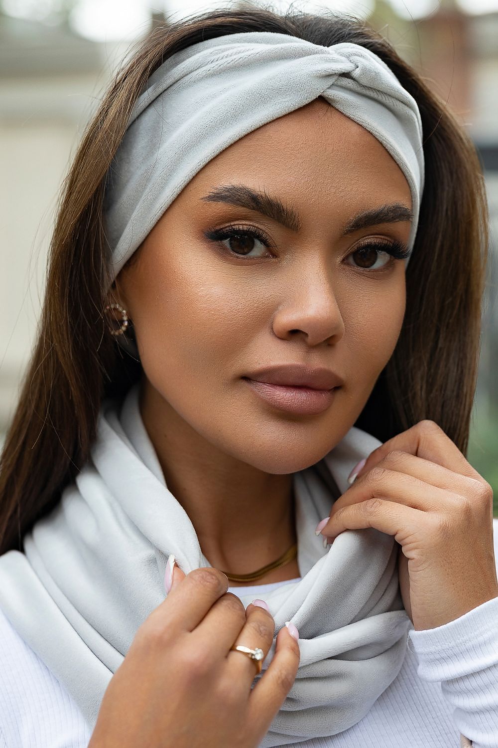 A unique headband and snood set, available in a wide range of colors. There's something for everyone. This patternless, universally cut set will complement most fall/winter outfits. Made of high-quality, soft, and comfortable velvet, it fits perfectly around the head. The front of the headband features a decorative interlacing with a bow. Ideal as a gift for a loved one. This set is a guarantee of the highest quality at a very attractive price. The headband and snood set was designed and sewn in Poland.