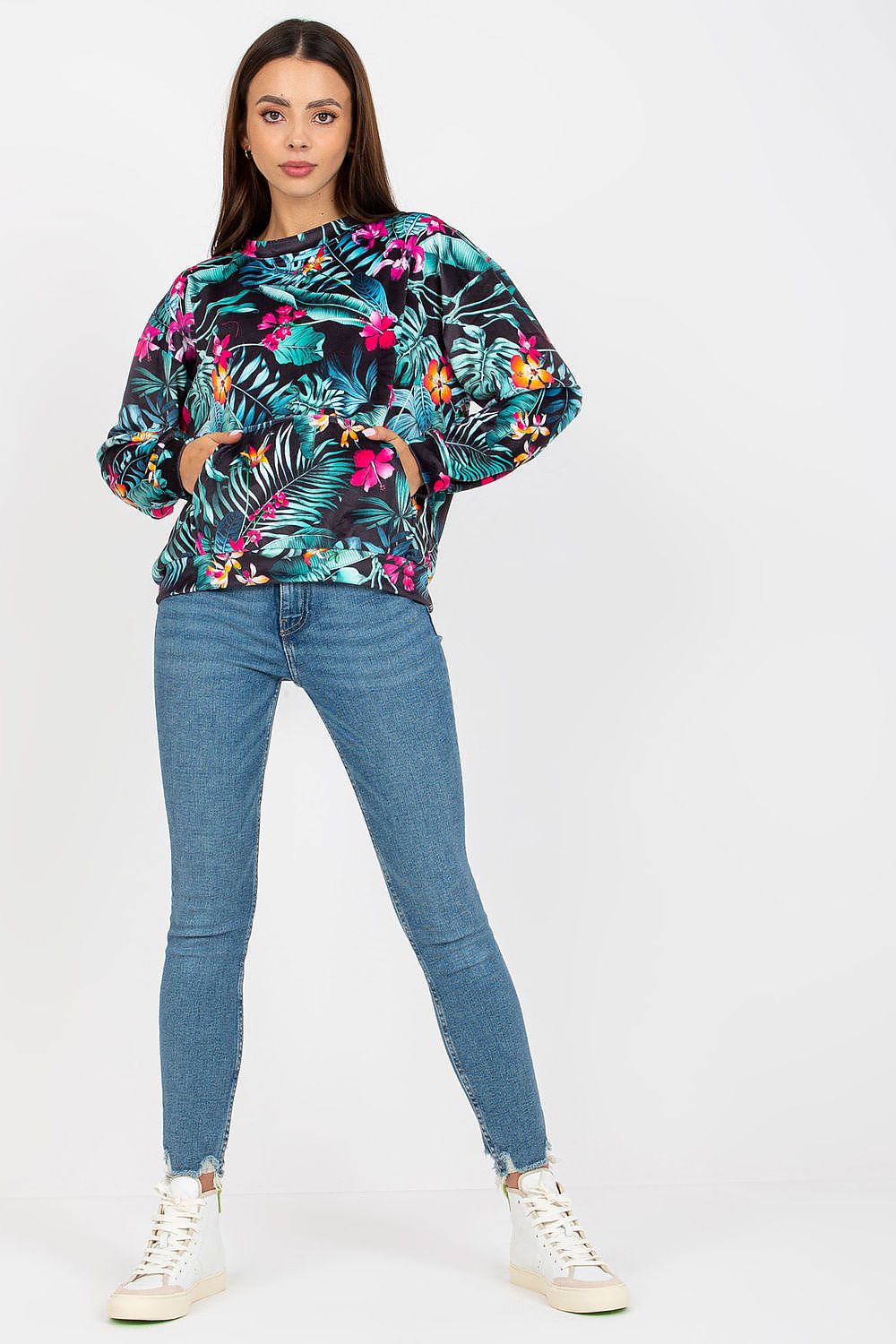 Women's long-sleeved sweatshirt with a round neckline. Kangaroo-style placket on the front.