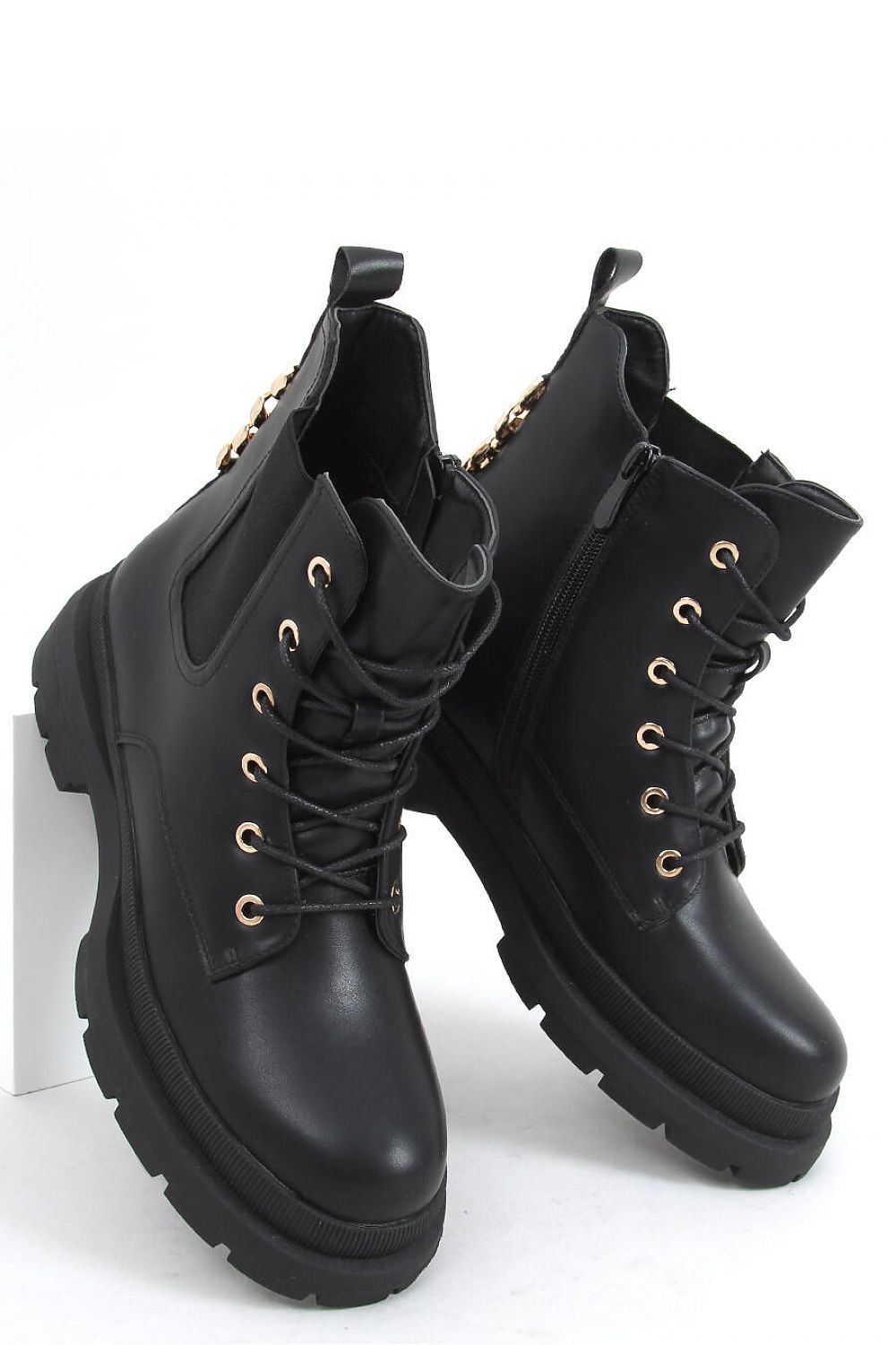 Bottes à lacets pour femmes à semelle épaisse. C'est un modèle unique avec une chaîne dorée très tendance à l'arrière de la tige, qui s'accorde parfaitement avec la couleur noire des chaussures. Elles sont classiquement lacées, grâce auxquelles elles peuvent être parfaitement ajustées à la taille de votre pied, mais elles ont aussi une fermeture éclair sur le côté. Ils sont fabriqués en cuir écologique et doublés d'une fourrure douce à l'intérieur.