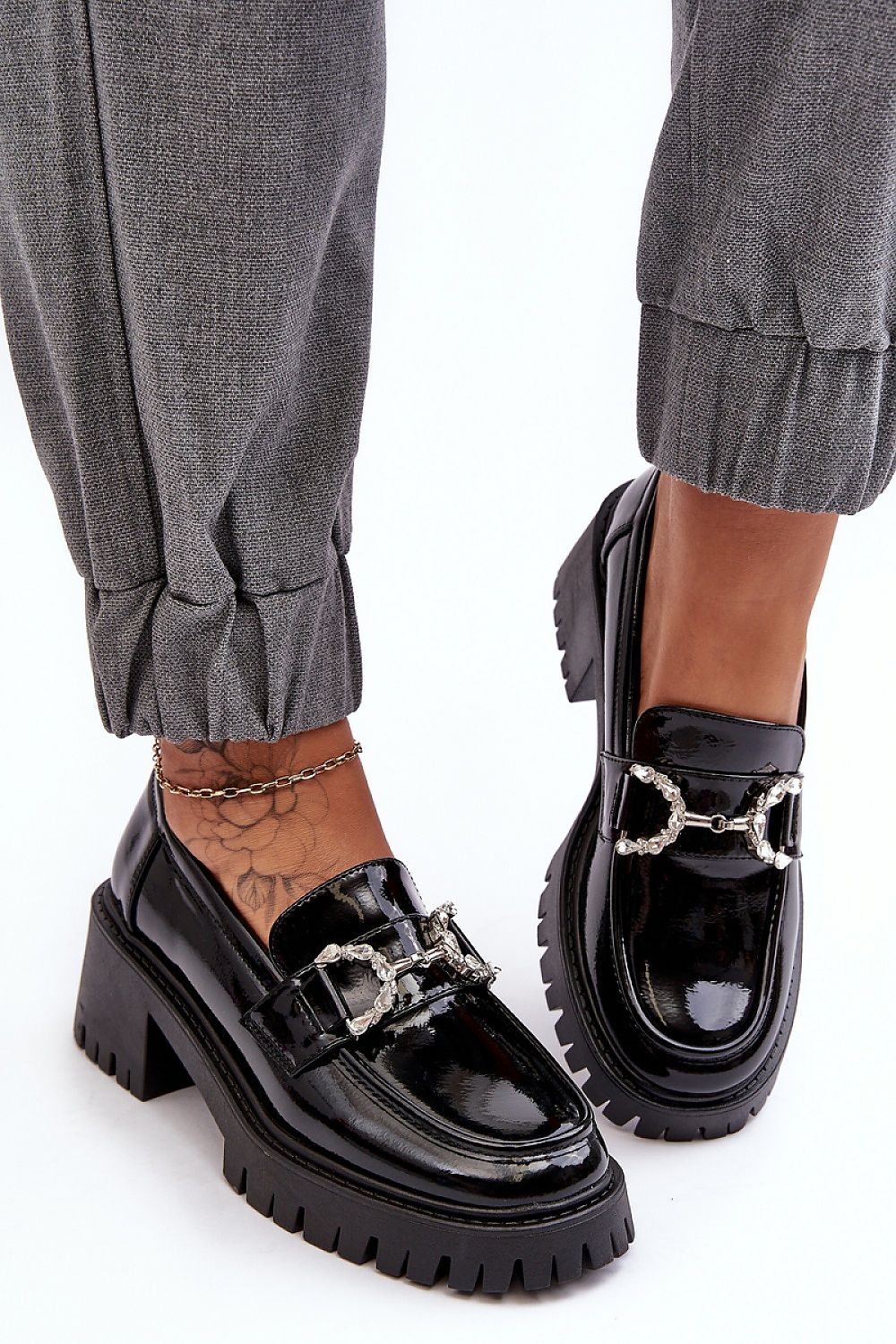 Semi-bottes pour femmes en cuir écologique. Montées sur un talon bas massif et une plateforme. Ornement bijou sur la bride avant. Bout arrondi. Contrefort de talon renforcé. Ce modèle vous permettra de créer de nombreuses tenues d'automne !
