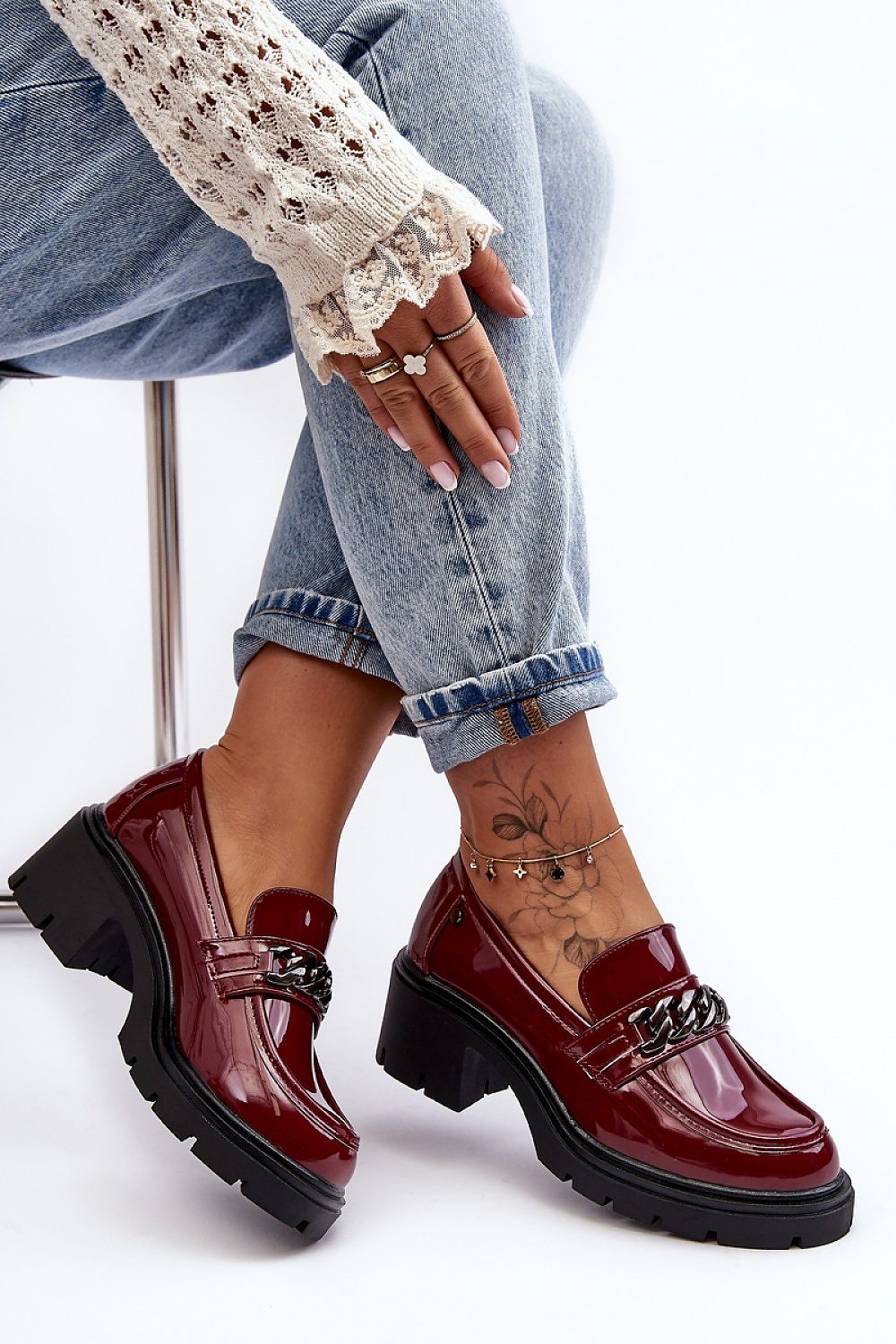 Semi-bottes pour femme montées sur un talon bas et solide. Fabriquées en cuir écologique. Ornement en chaîne sur la bride avant. Bout arrondi. La semelle intérieure souple en cuir écologique offre un grand confort d'utilisation. De plus, le contrefort du talon est renforcé.