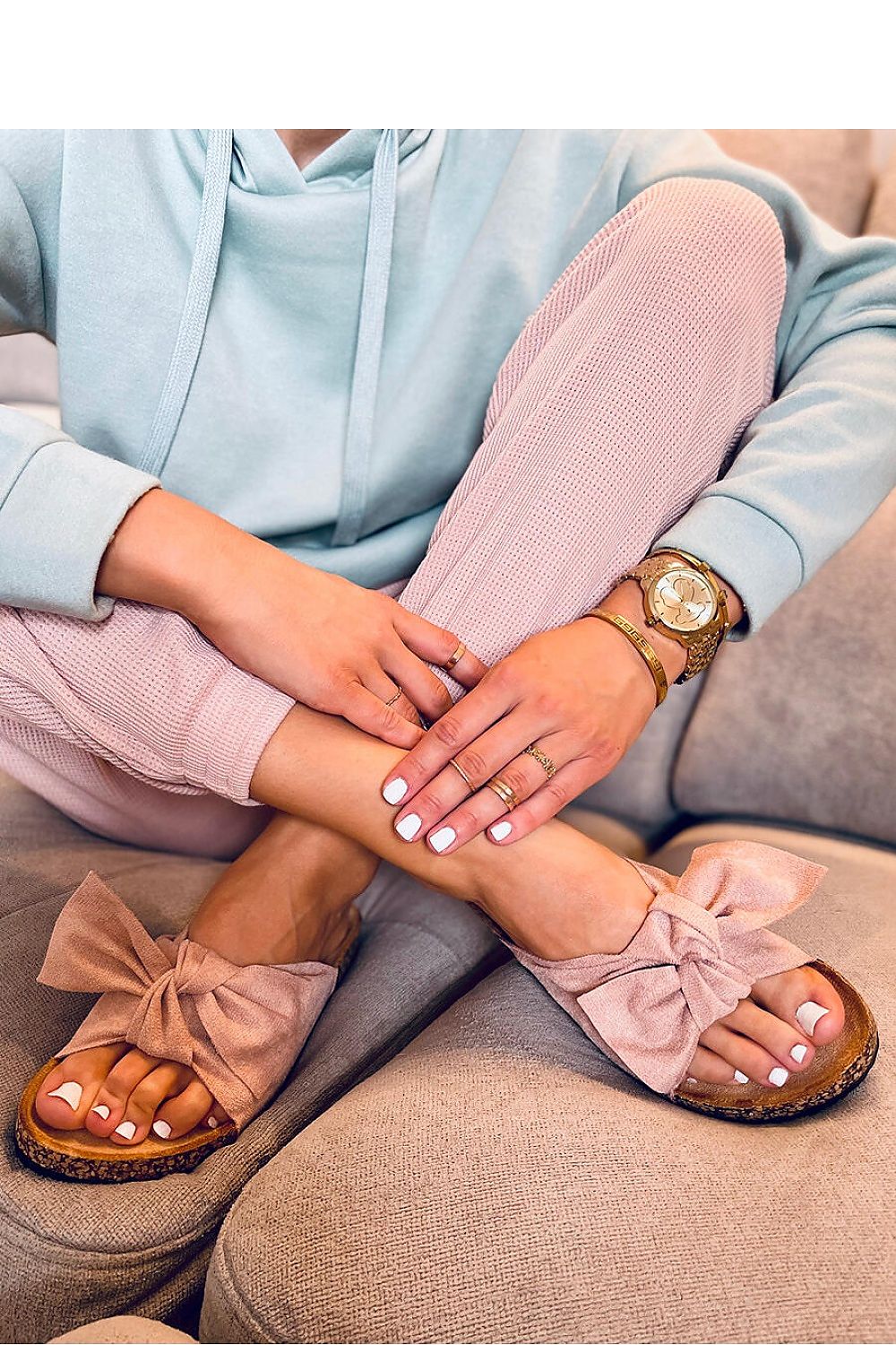 Tongs en daim pour femmes. Coupe absolument fashion sur une semelle en liège et avec un magnifique nœud ! La semelle intérieure profilée et doublée de tissu assurera le confort à chaque pas... Nous garantissons qu'ils répondront à vos attentes : ) Matériau extérieur ? daim écologique.