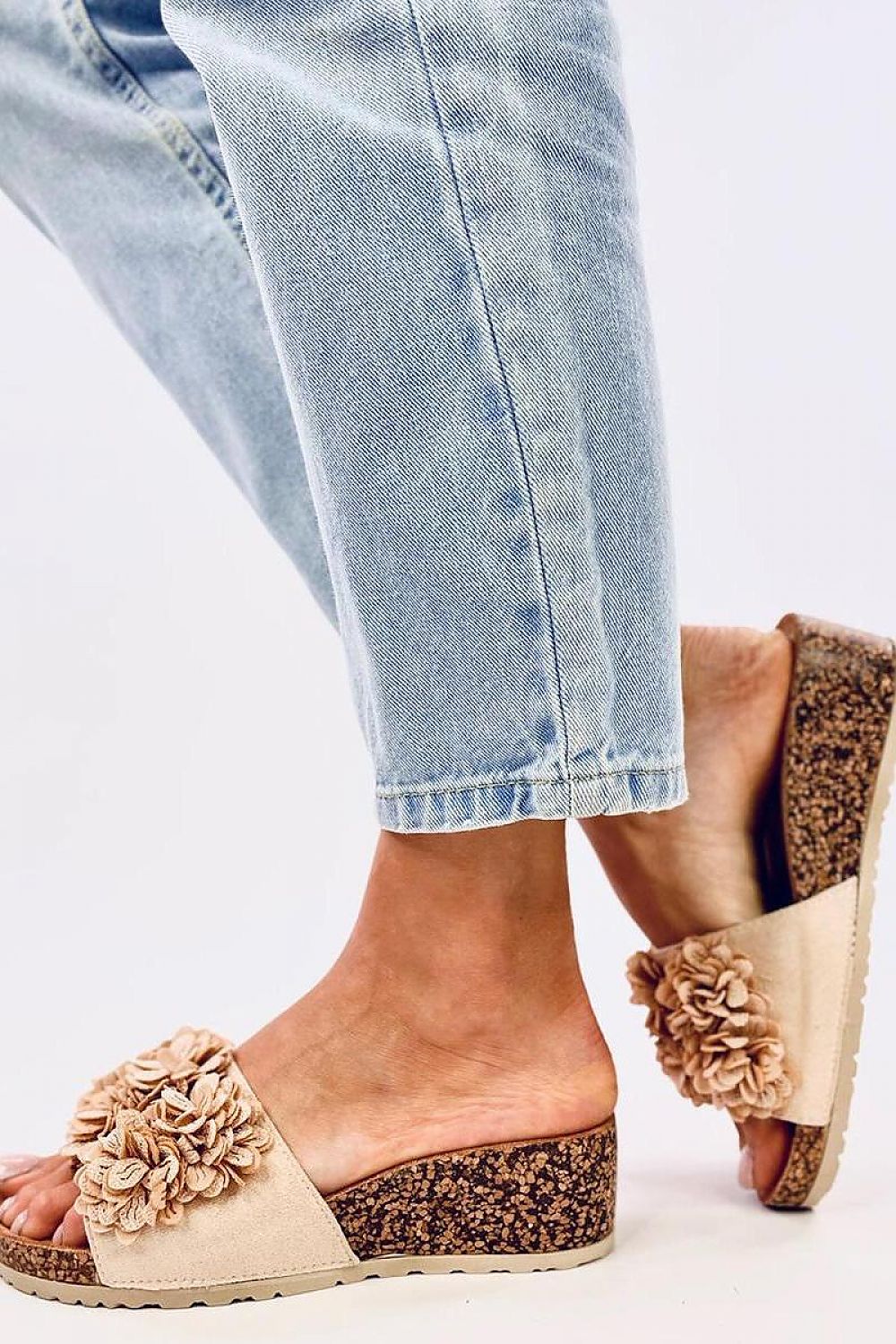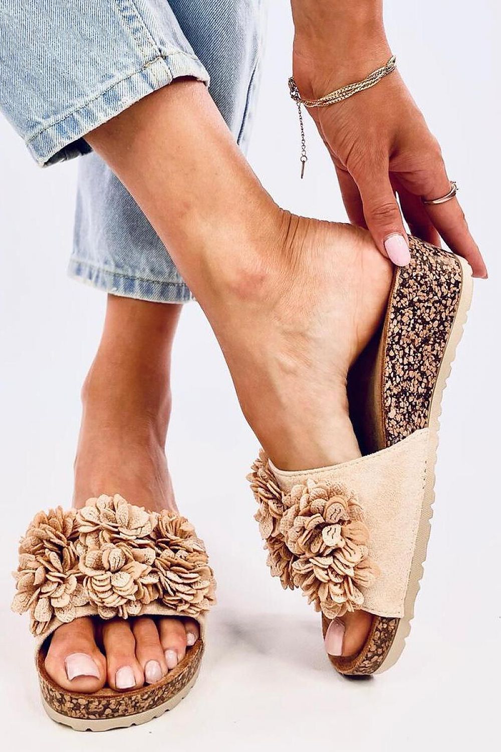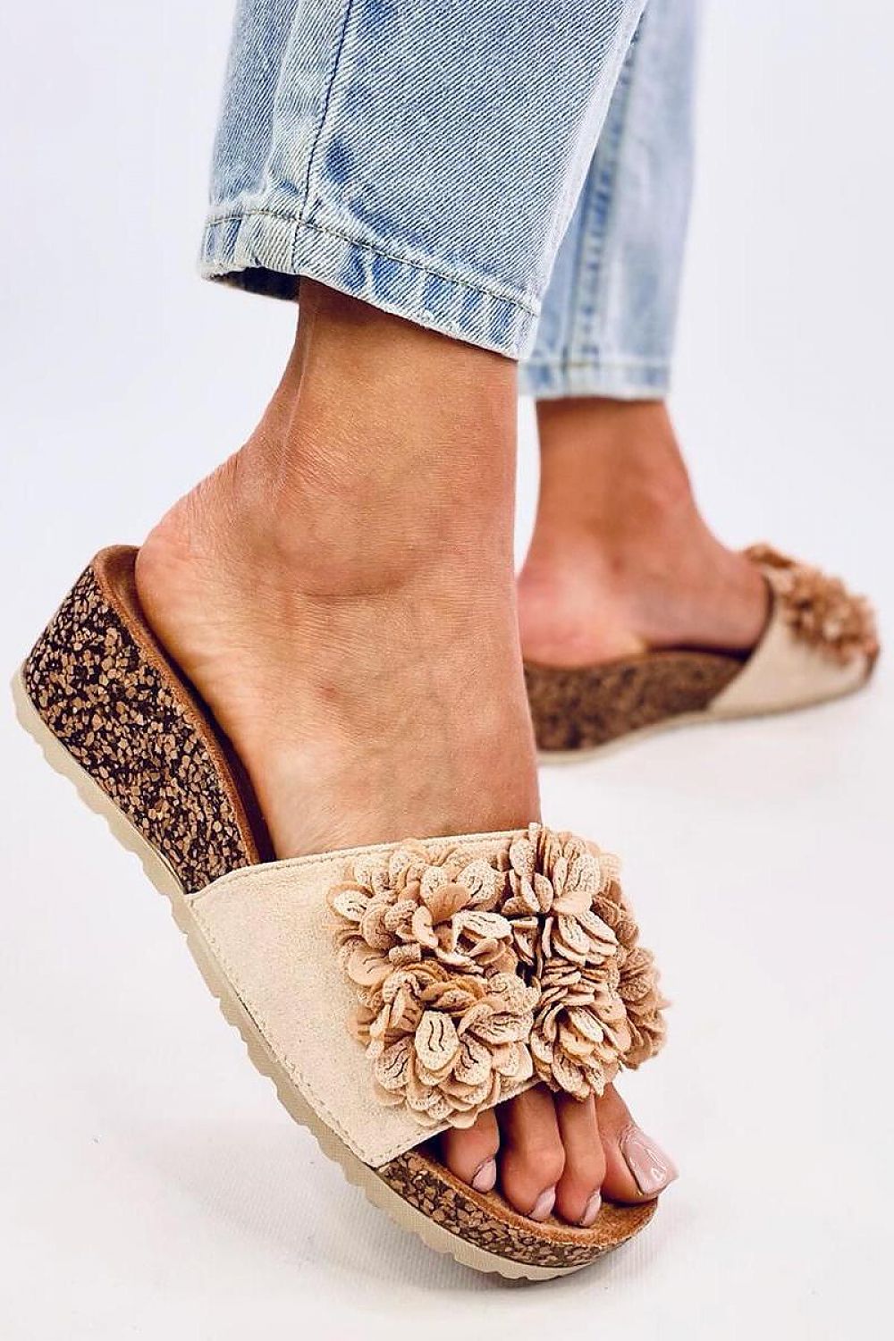 Claquettes compensées pour femmes avec semelle en liège de 5 cm de hauteur. Le regard est attiré par une charmante application florale... Les claquettes compensées sont extrêmement populaires parmi les adeptes du confort, donc si vous appréciez le confort, vous devez les avoir ! Matériau extérieur : daim écologique.