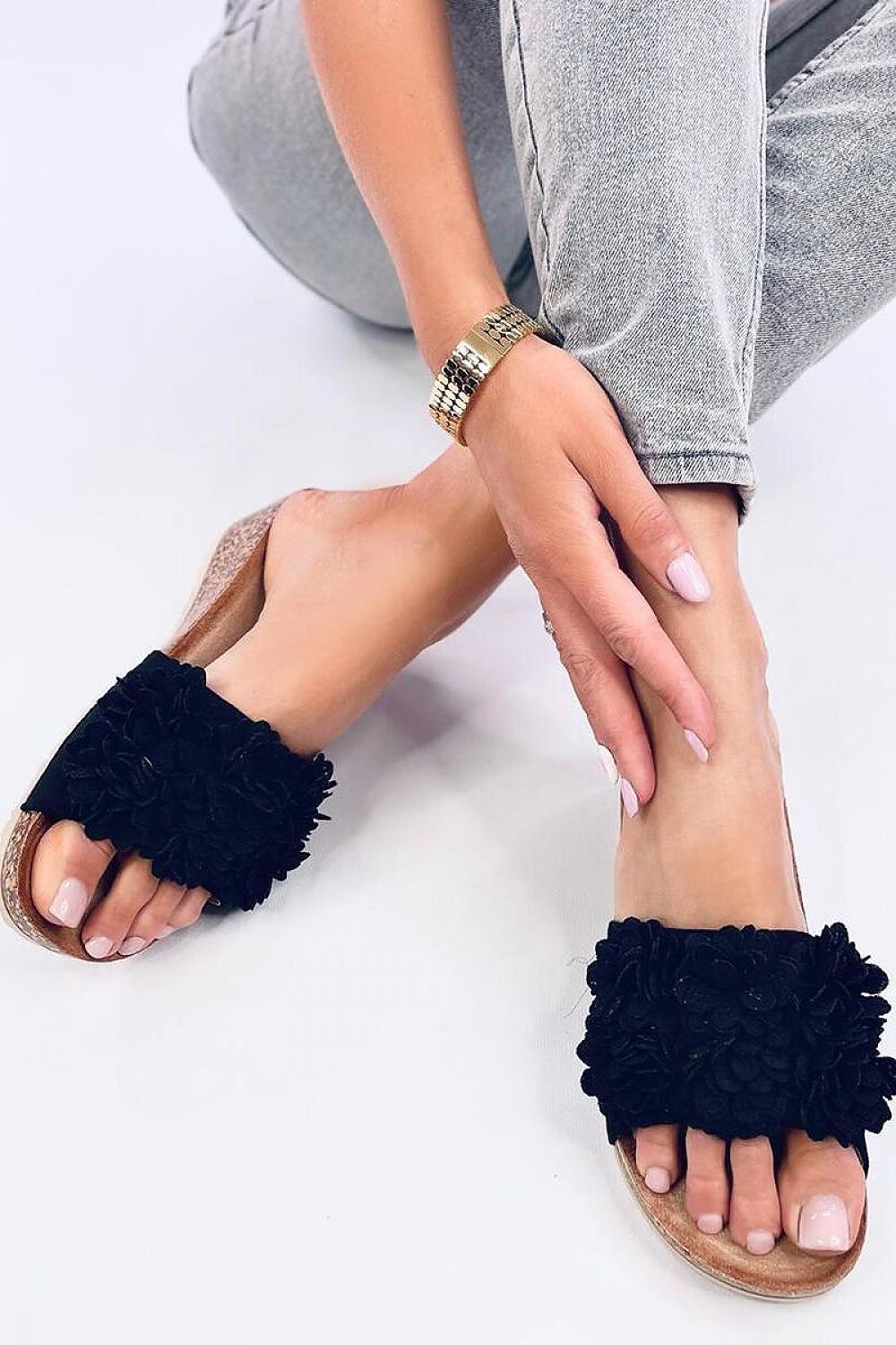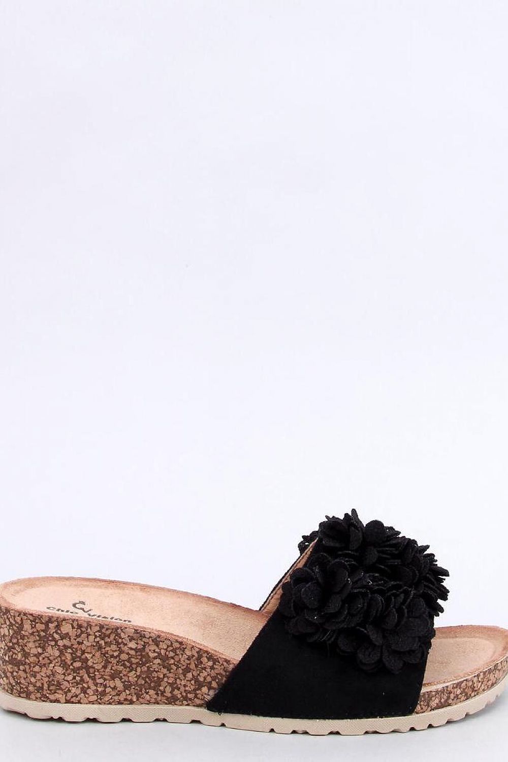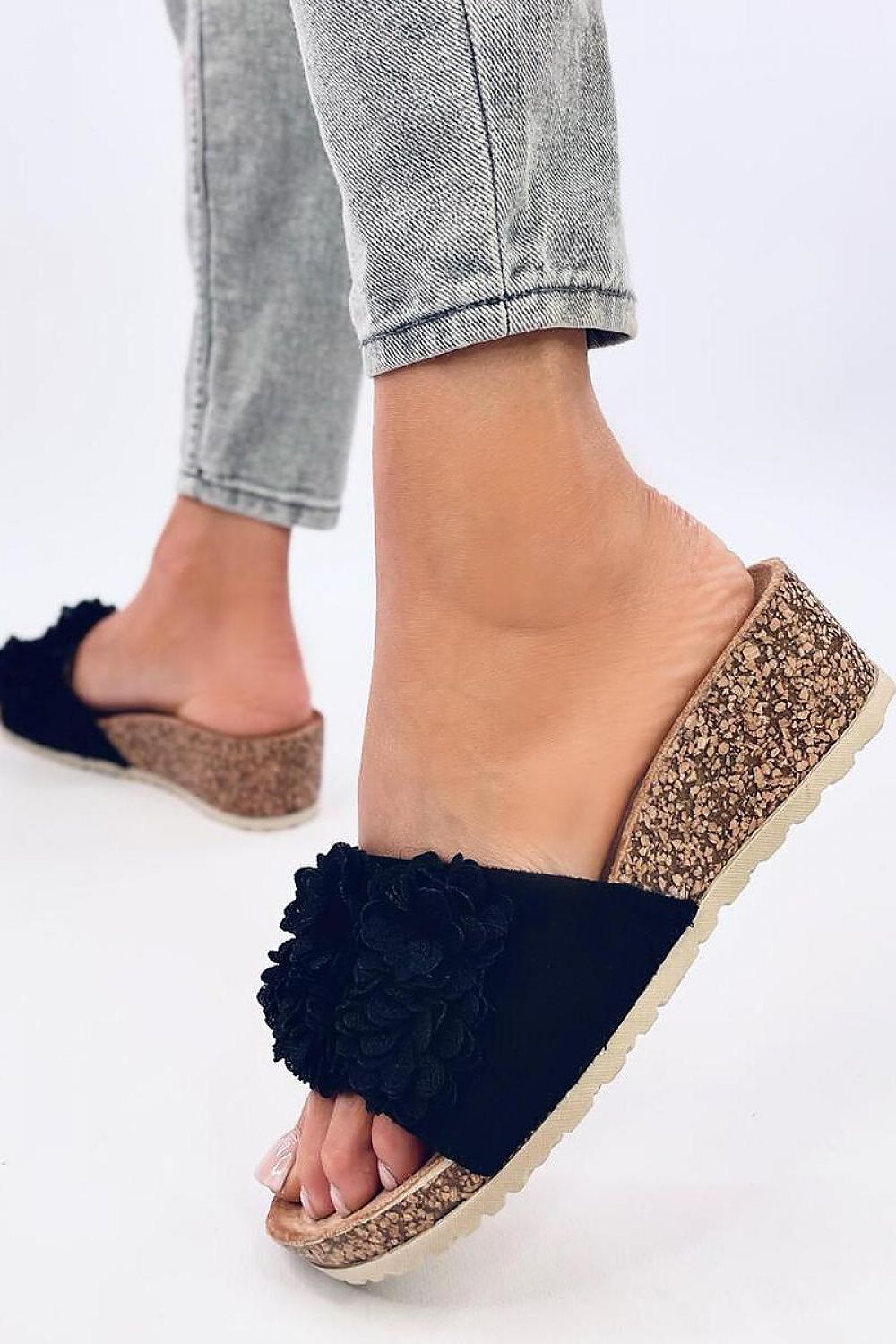 Claquettes pour dames sur cale de liège d'une hauteur de 5 cm. L'attention est attirée par une ravissante application florale... Les claquettes sur cale sont extrêmement populaires parmi les amateurs de confort, donc si vous valorisez le confort, vous devez les avoir ! Matériau extérieur ? daim écologique.
