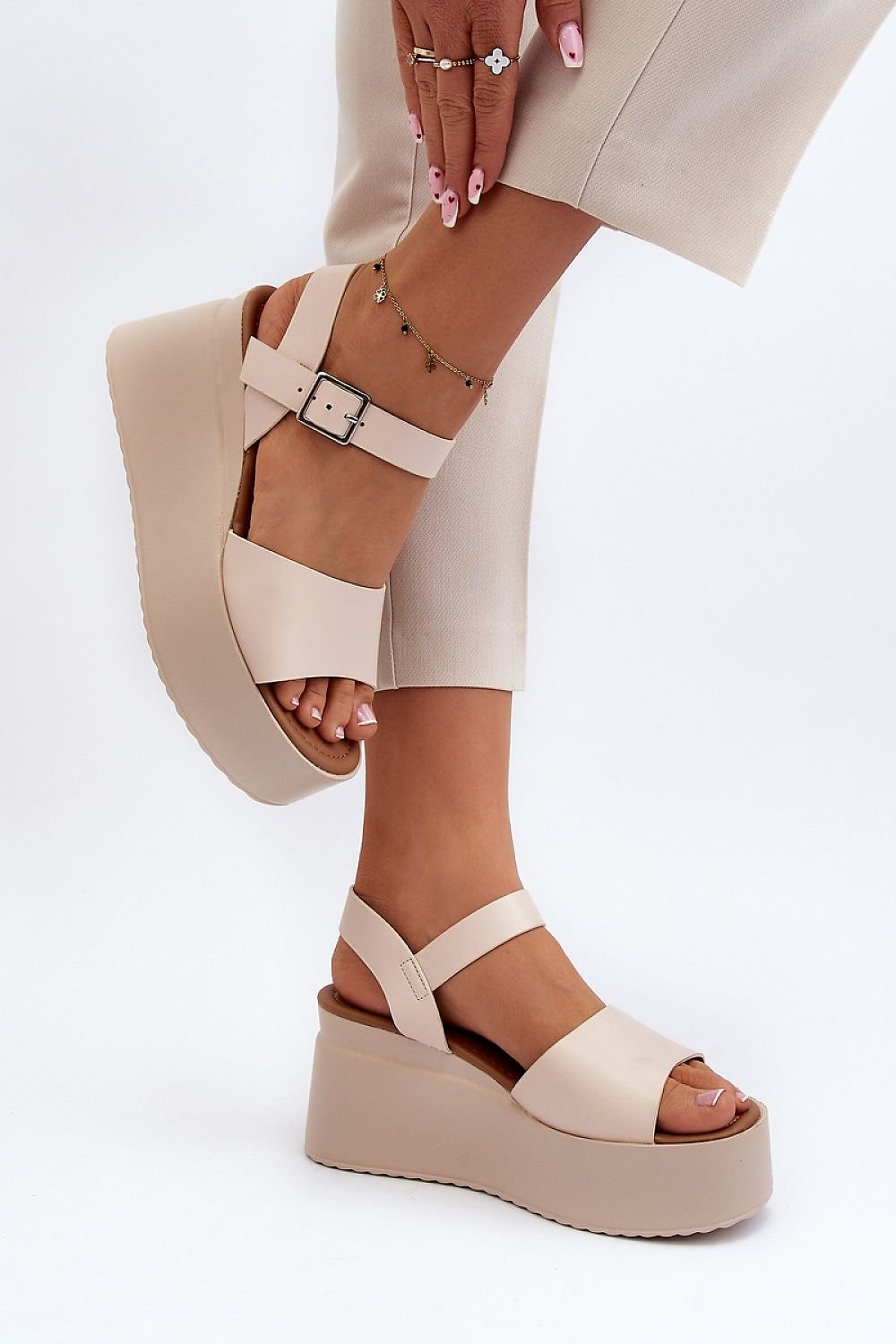 Sandales pour femmes en cuir écologique. Elles sont montées sur une ancre et une plateforme, ce qui leur confère non seulement un look très tendance, mais leur assure également une bonne stabilité lors de la marche. Fermées par une bride réglable à boucle, vous pourrez facilement les ajuster à votre pied. Ce modèle sera parfait pour les promenades estivales ou les rassemblements en plein air !