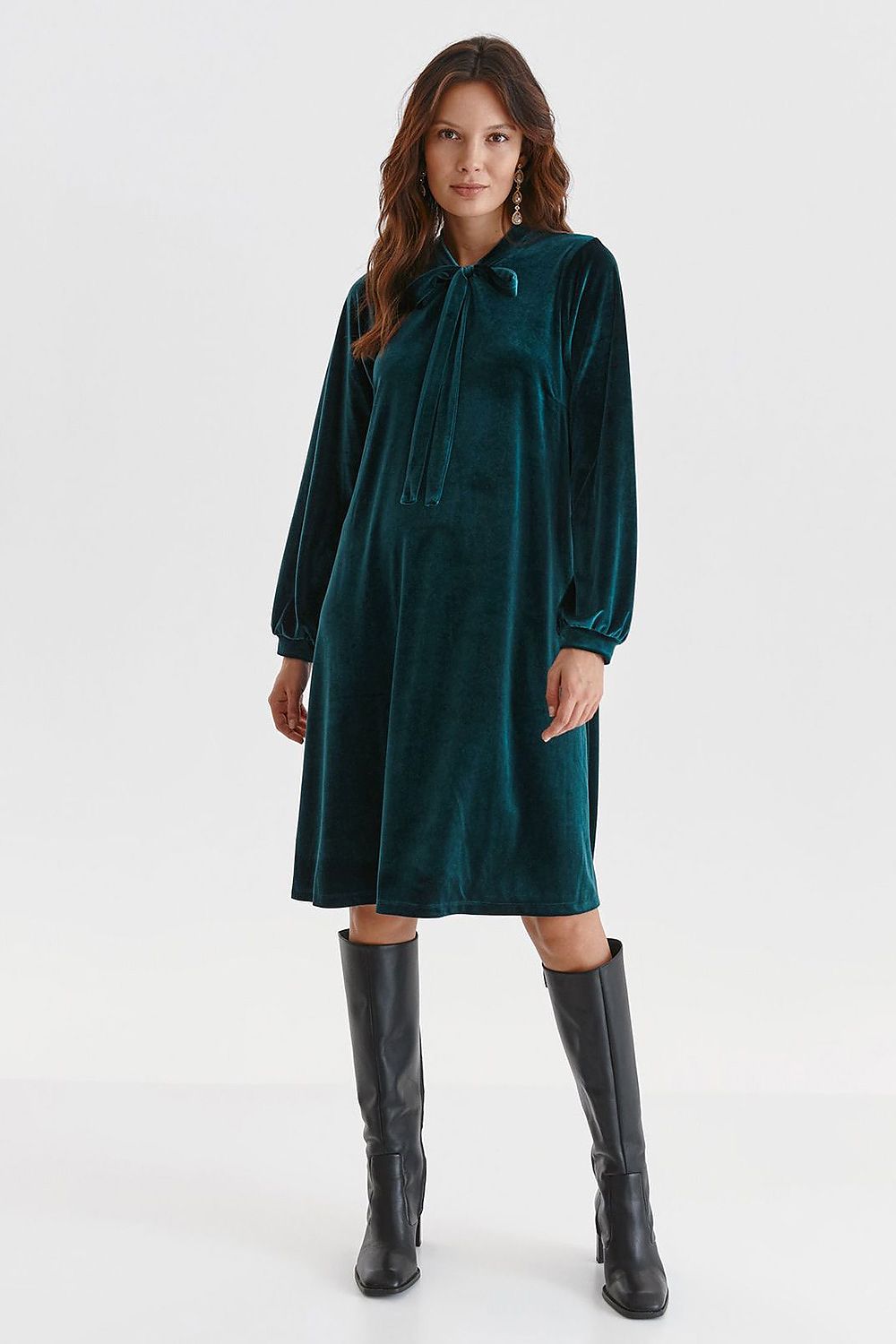 Confortable et facile à porter, cette robe a une coupe ample et simple et une longueur au genou. Il a des manches longues droites terminées par un ourlet côtelé et un col accrocheur sur un délicat col montant avec un lien fantaisie à l'avant. Il est fabriqué à partir d'un tricot très agréable au toucher et chaud, captivant par sa douceur et sa brillance délicate.