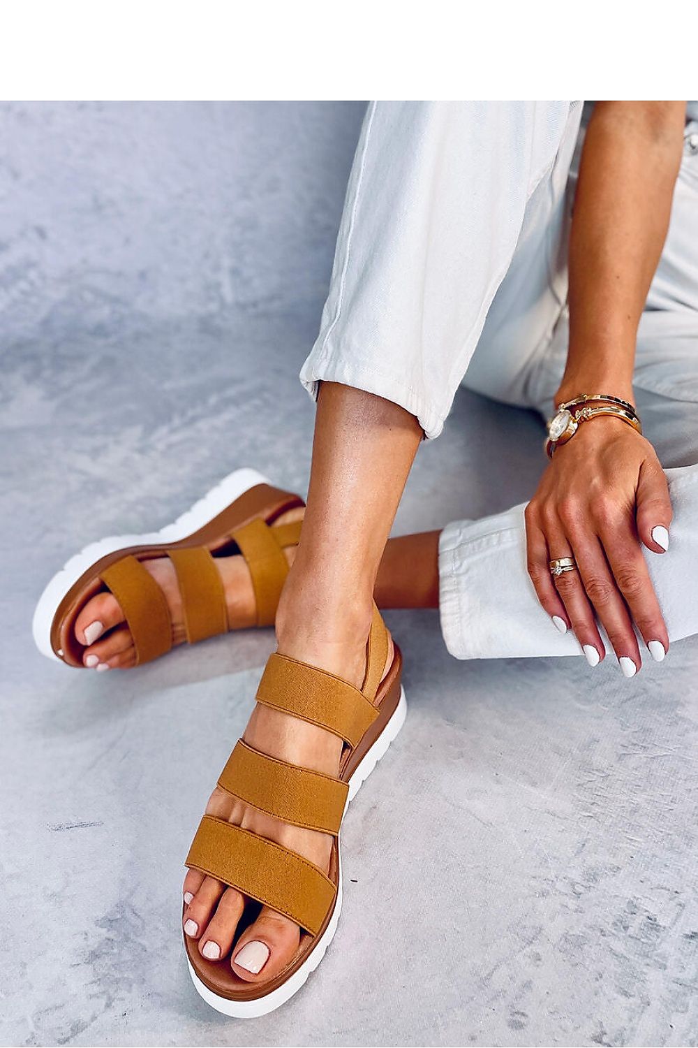Sandales légères pour femmes, avec un talon de 6 cm. Les sangles élastiques au milieu du pied assurent un ajustement parfait à la jambe, et la plateforme à la mode - 3 cm - garantit la stabilité. Vous voudrez certainement les emmener avec vous lors de vos promenades en vacances ! Matière extérieure ? tissu élastique/caoutchouc.
