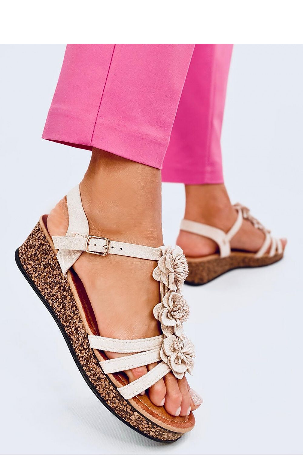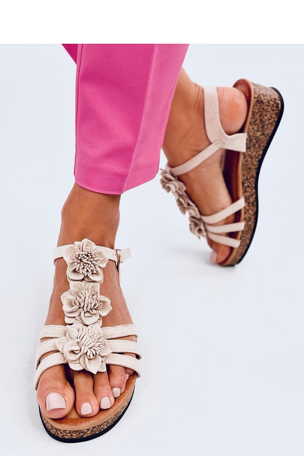 Sandales pour femmes sur un talon en liège d'une hauteur de 5 cm. L'application florale qui souligne le milieu du pied attire l'attention... La semelle intérieure souple et la plateforme de 2 cm de haut garantissent le confort à chaque pas - vérifiez-le vous-même : ) Matière extérieure ? daim écologique.