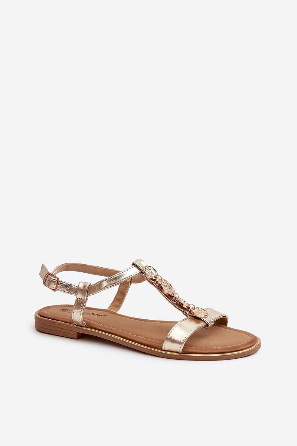 Sandales pour femmes avec de subtils ornements dorés. Fabriquées en cuir écologique. Montées sur un talon plat. Fermées par une bride réglable à boucle, elles sont à la fois tendance et confortables. Idéales pour un usage quotidien.